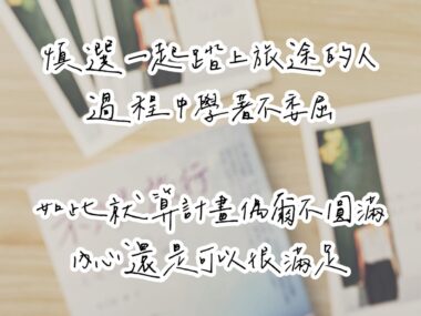 「慎選一起踏上旅途的人,過程中學著不委屈。如此就算計畫偶爾不圓滿,內心還是可以很滿足」──《不只是旅行》   你以為這篇在講「旅伴關係」嗎?不,我同時也在講「伴侶關係」。