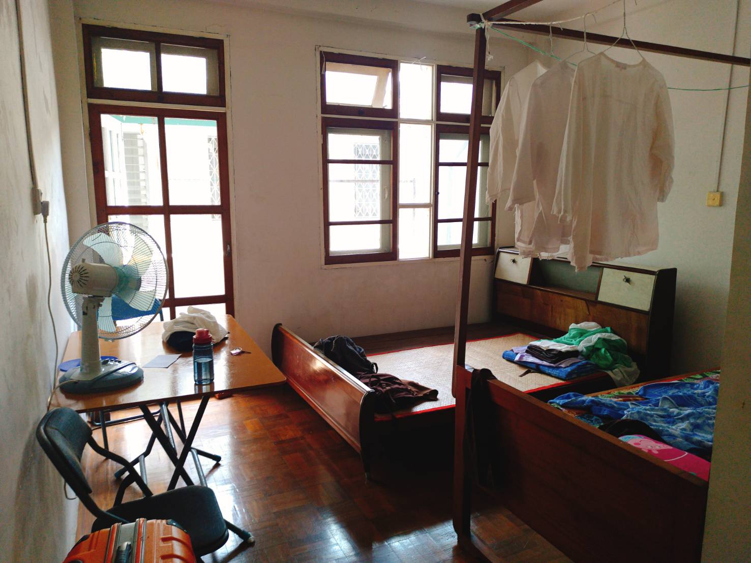 如果你是緬甸人,要嘛兩人一間,要嘛就是住舊宿舍,窗戶沒有紗窗只有窗櫺,所以晚上什麼東西都有可能飛進來,蚊帳是標準配備。上廁所是共用、洗澡是公用的大水池,圍著浴巾去舀水來洗。介紹我去的朋友是男生,他說他住過這種宿舍,房間小、設備老舊、洗澡的時候旁邊還會有青蛙在跳。